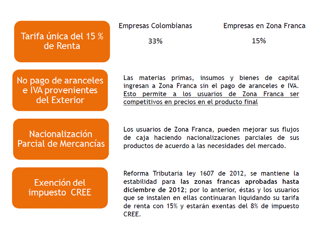 15% de Impuesto de Renta sobre el 100% de la operación, no existiendo obligación de Exportaciones y pudiendo ser 100% la venta en Mercado colombiano, Vrs. 33% en operación por fuera de Zona Franca. Reducción de Impuestos locales (municipios) No IVA en compras Locales. Z F Hernando Caicedo T. No aranceles ni IVA, en compras Internacionales. No IVA en compras de Activos Fijos.